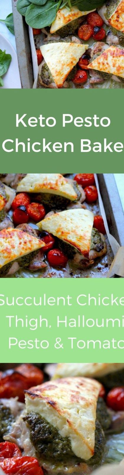 This Keto Pesto Chicken Bake is a simple and flavorful one-tray meal that's perfect for busy weeknights. Tender chicken breasts are smothered in keto-friendly pesto sauce, topped with savory haloumi cheese, and surrounded by juicy cherry tomatoes. It's a satisfying and low-carb dinner option that the whole family will love!